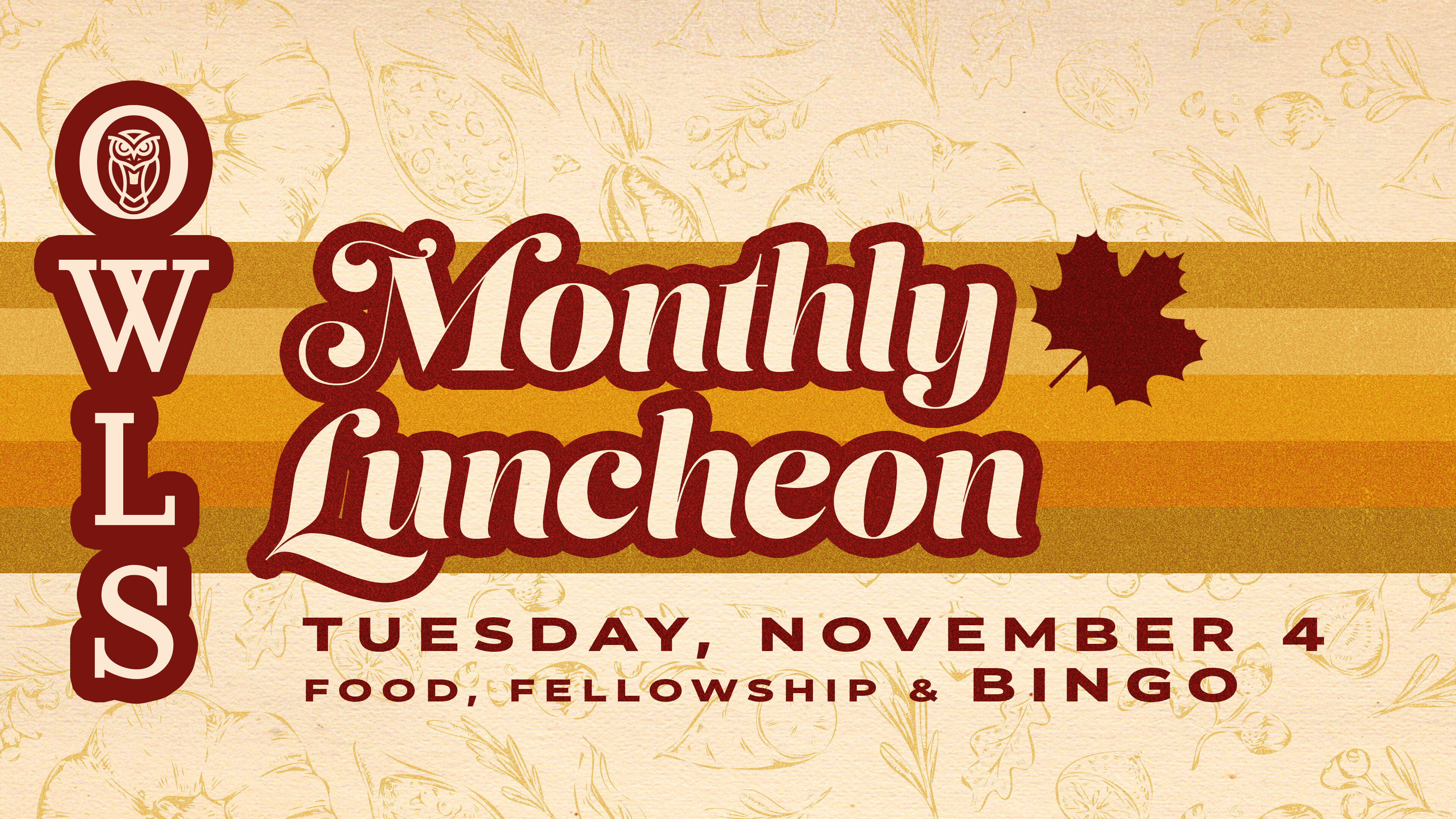 Senior Adults, join us Tuesday, November 4 at noon in Fellowship Hall for our monthly luncheon! We'll have great food, fellowship and play bingo! Sign up through the church office or online.