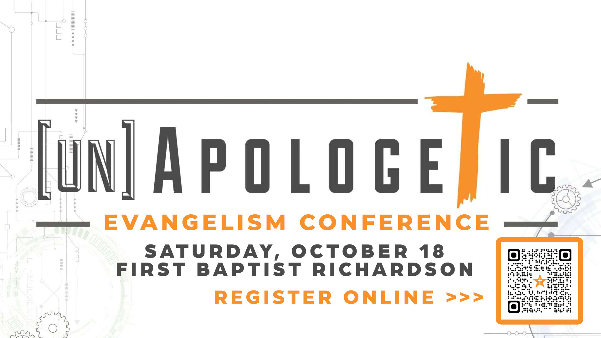 Saturday, October 18, 8 am - 5:30 pm at First Baptist Richardson. Conference featuring guest speakers Lee Strobel, Sean McDowell, and Eric Hernandez. During this one-day conference, participants hear biblical truth backed up with logic and evidence expressed in gentleness and respect. General speaking sessions and workshops are provided to help individuals strengthen their faith and learn how to engage others with the Gospel, for which we do not apologize. Our hope is for attendees to leave the conference strengthened, inspired, and prepared to share the exciting news about Jesus Christ!