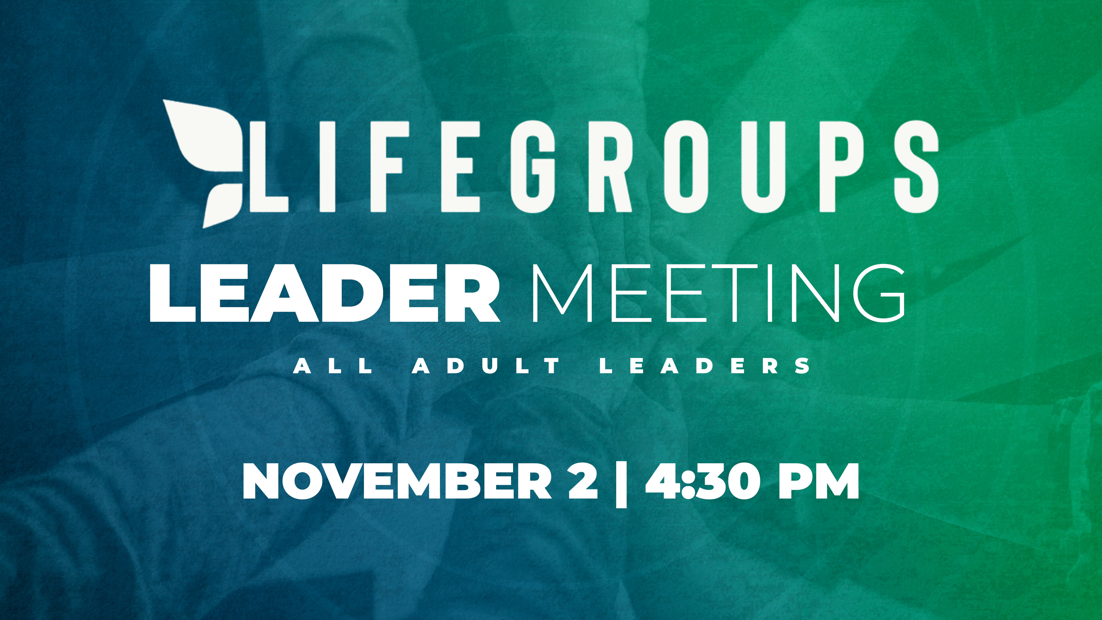 Leaders, please plan to attend our Life Group leadership meeting on Sunday, November 2 at 4:30 pm.