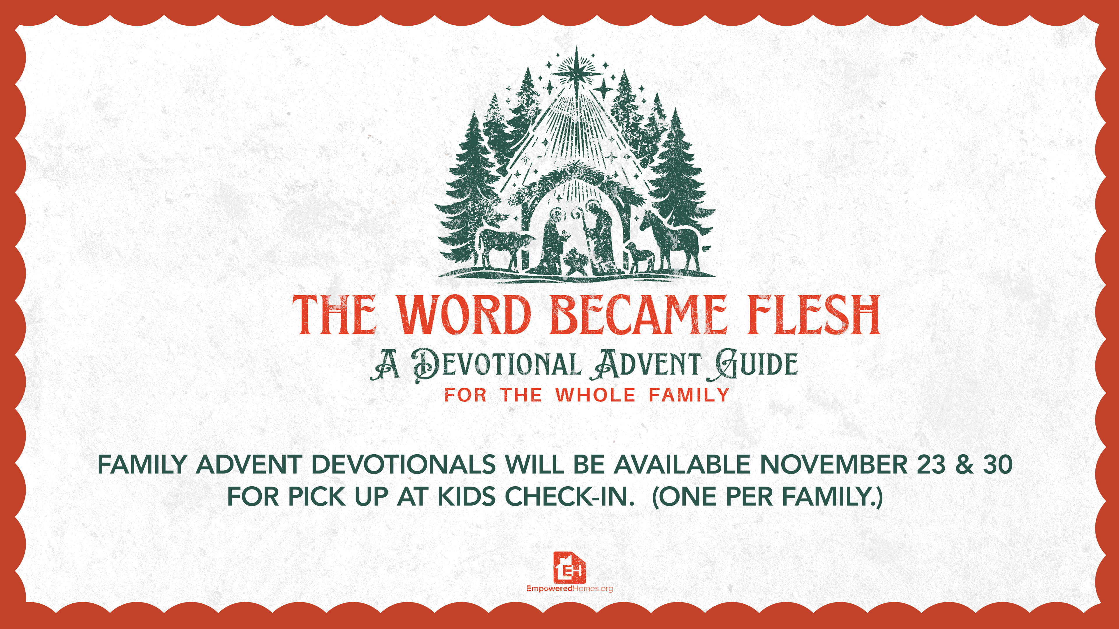 Family Advent Devotionals will be available November 23rd and November 30th for pick up at Kids Check-In. Take one home and prepare your hearts for Christmas with Scripture, reflection, and meaningful moments together. (One per family.)