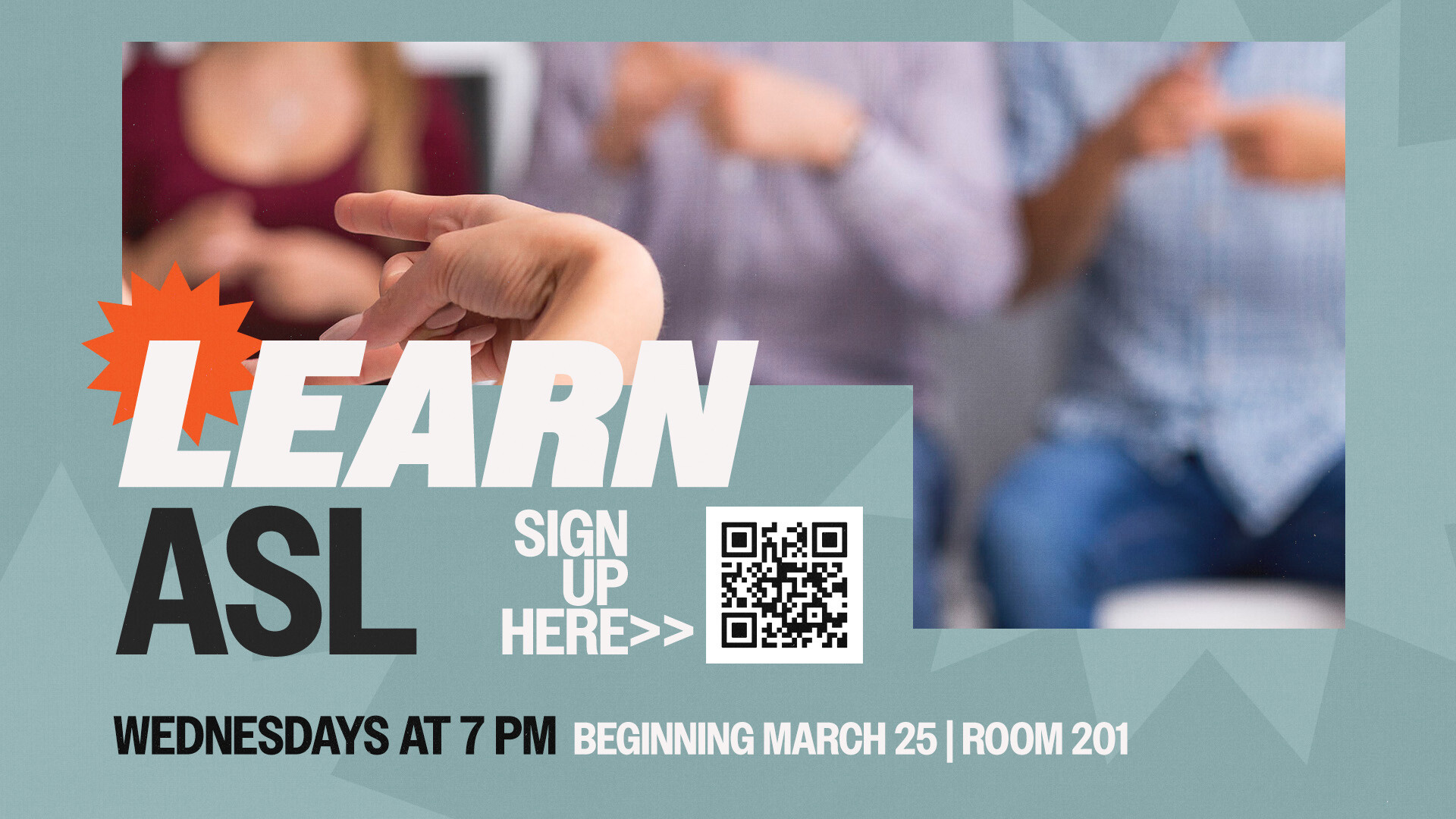 Join Monika Brauer for an ASL class on Wednesdays at 7 PM, starting March 25, in Room 201.