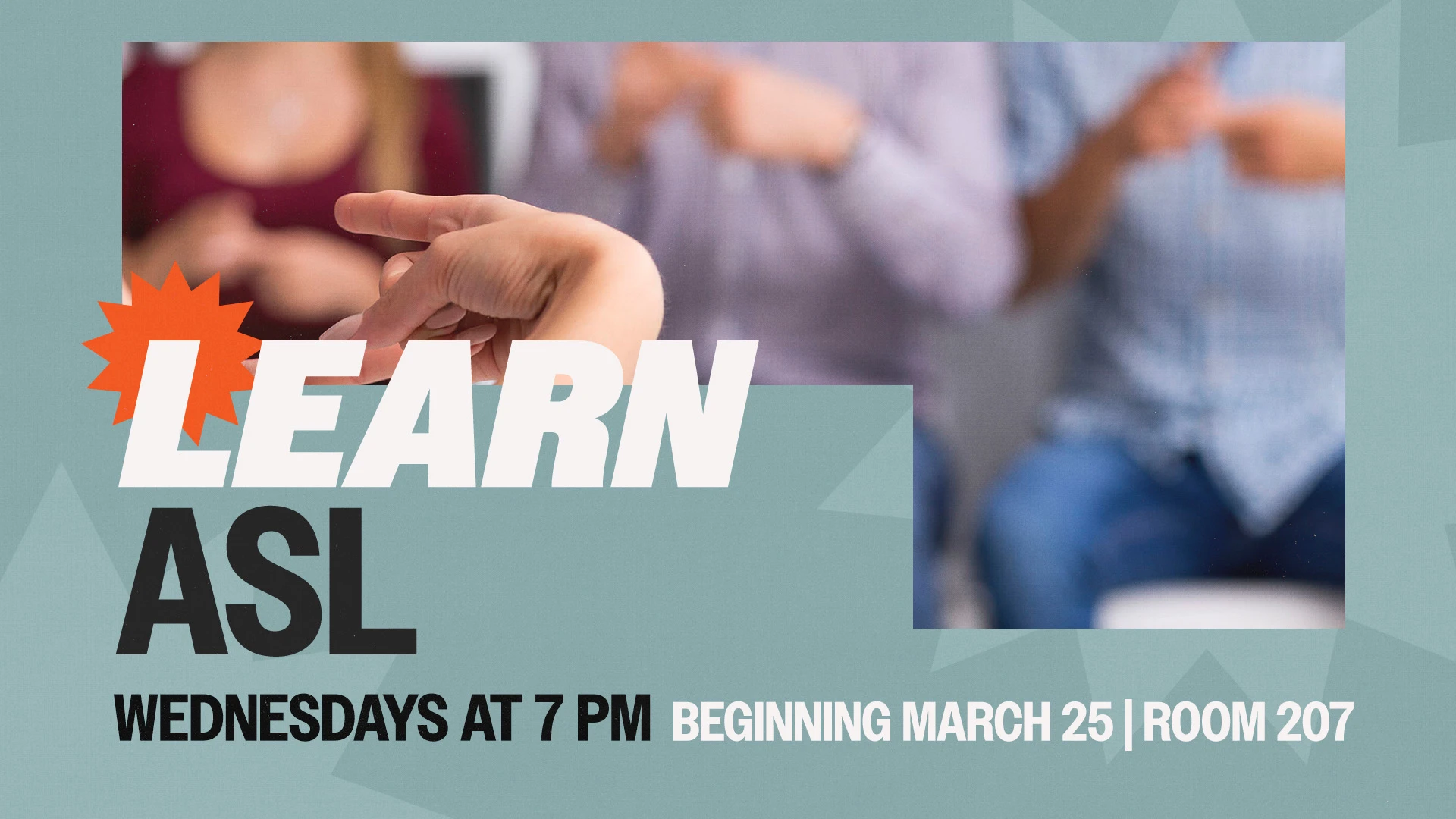 Join Monika Brauer for an ASL class on Wednesdays at 7 PM, starting March 25, in Room 207.
